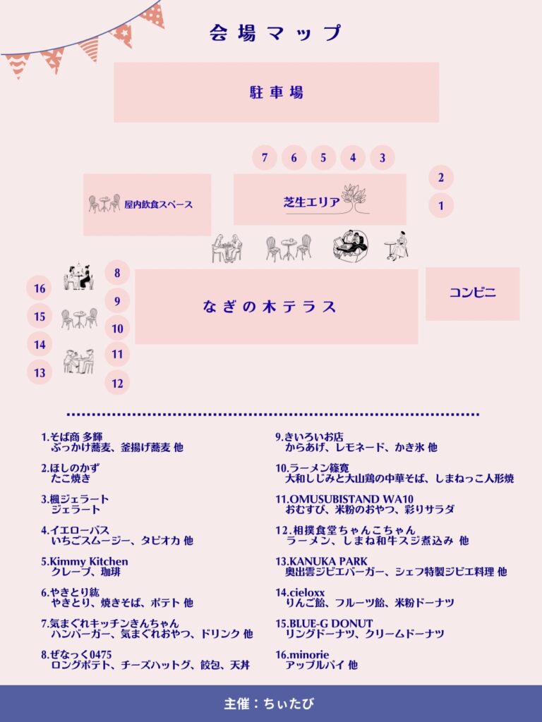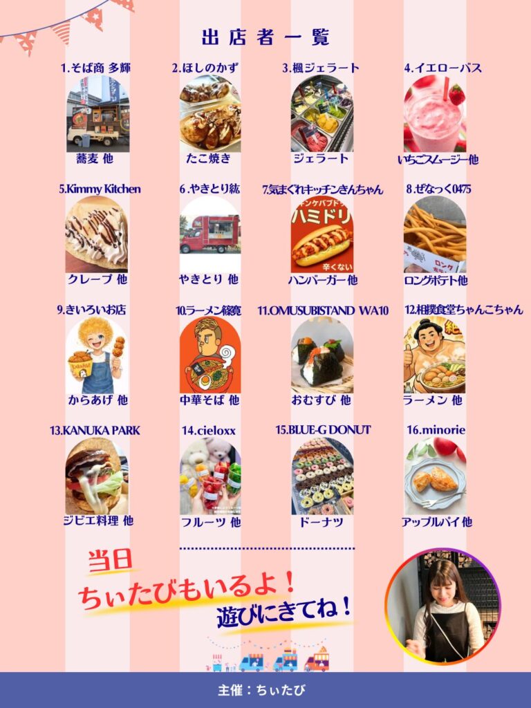 | 🏠出店リスト | ・そば商 多輝 ・ほしのかず ・楓ジェラート ・イエローバス ・Kimmy Kitchen ・やきとり紘 ・気まぐれキッチンきんちゃん ・ぜなっく0475 ・きいろいお店 ・ラーメン篠寛 ・OMUSUBISTAND WA10 ・相撲食堂ちゃんこちゃん ・KANUKA PARK ・cieloxx ・BLUE-G DONUT ・minorie |