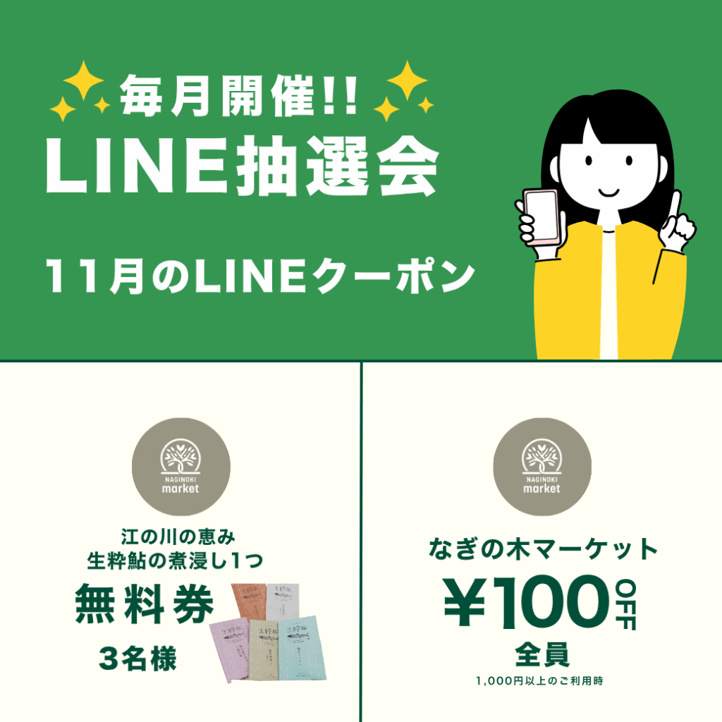 なぎの木テラス公式LINEアカウントにて、毎月変わる!スペシャル抽選&クーポンを、お届けしています。ぜひ公式アカウントと友達になって、抽選&クーポンを楽しみにお待ちください。