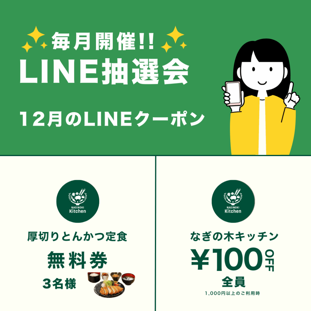 なぎの木テラス公式LINEアカウントにて、毎月変わる!スペシャル抽選&クーポンを、お届けしています。ぜひ公式アカウントと友達になって、抽選&クーポンを楽しみにお待ちください。