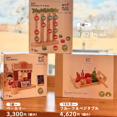 ゴムの木から作られたプラントイは、お子様が舐めてしまっても安心な塗料を使っています。 優しい手触りを、ぜひ店頭で確かめてみてください!
