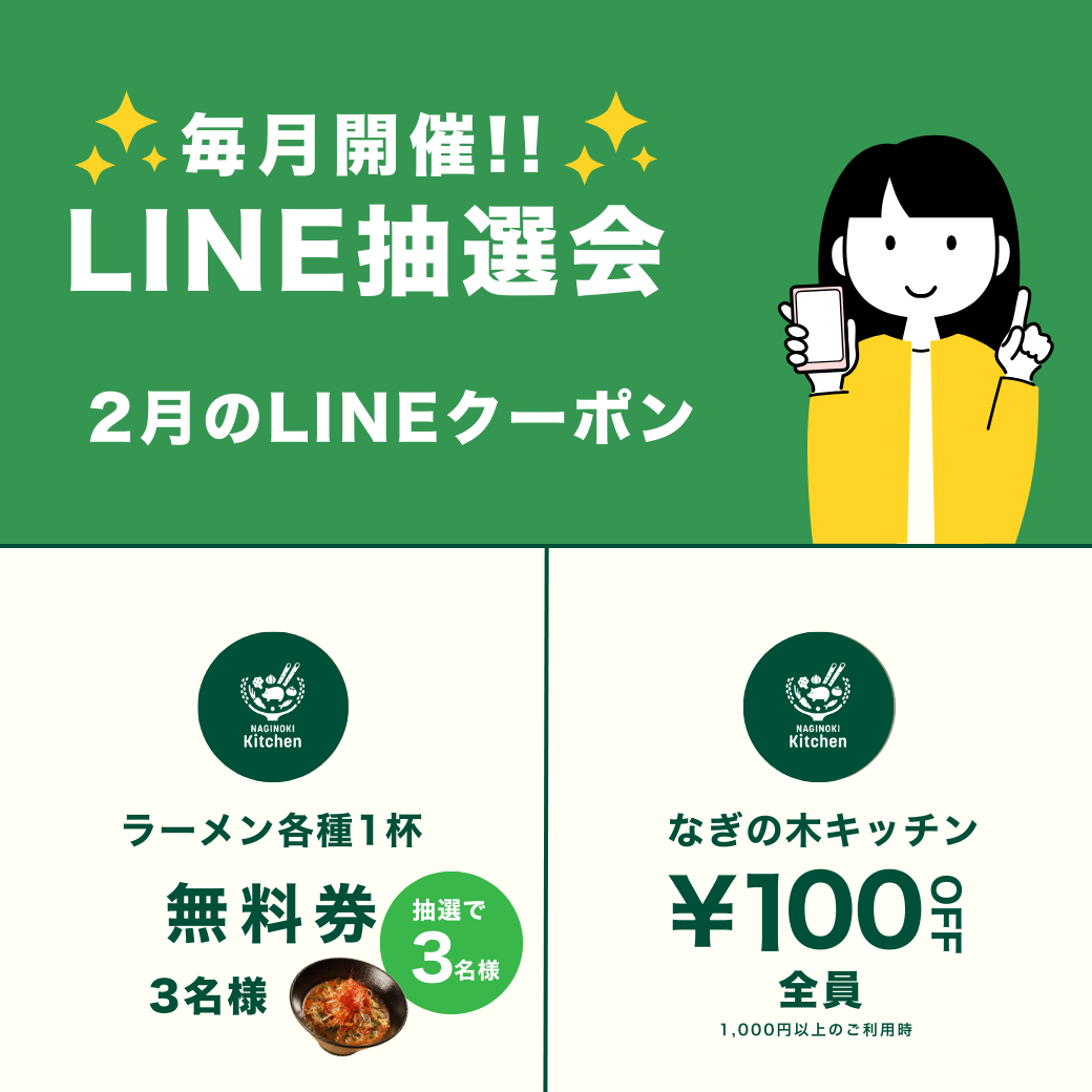 なぎの木テラス公式LINEアカウントにて、毎月変わる!スペシャル抽選&クーポンを、お届けしています。ぜひ公式アカウントと友達になって、抽選&クーポンを楽しみにお待ちください。